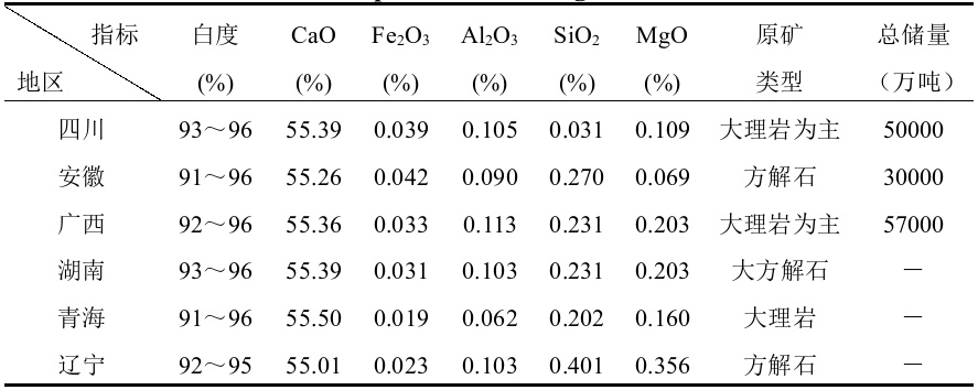 國內部分省某地區(qū)優(yōu)質碳酸鈣原礦組成調查表