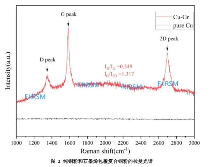 1、該實驗工作已在球形銅粉顆粒上包覆少層或單層石墨烯,如圖 2 所示為純銅粉和石墨烯包覆復合銅粉的拉曼光譜。測試表明,石墨烯缺陷較少,質量較高,晶體結構良好。