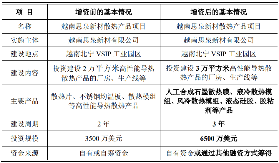 截至當前,越南思泉新材散熱產品項目已完成境外投資備案手續,和越南思泉新材的注冊登記手續,并已取得《土地使用權及與土地相關資產所有權證書》。鑒于越南思泉新材散熱產品項目的規劃用地及主要經營產品范圍增加,公司將越南思泉新材散熱產品項目的投資總額從3500萬美元增加至6500萬美元。