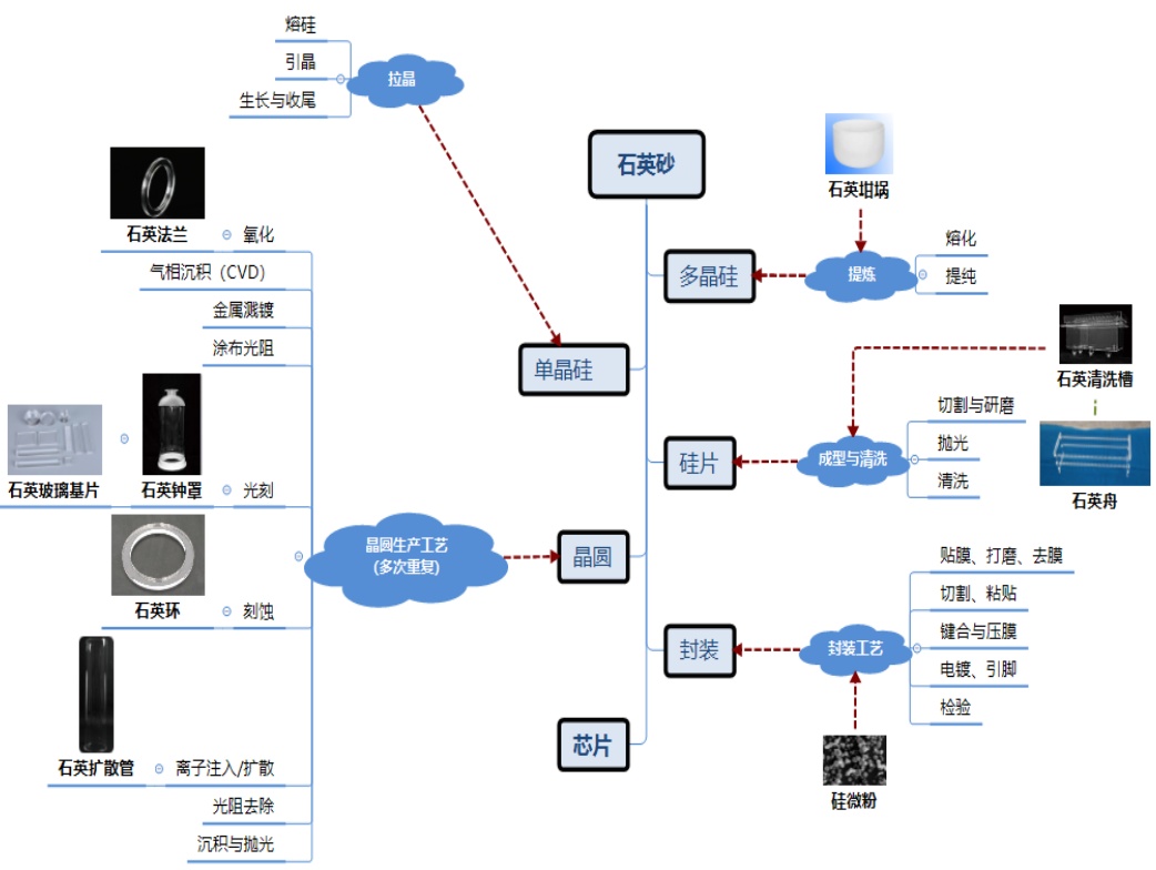 在半導體集成電路與芯片制造中,石英坩堝、石英管、石英舟、石英支架等各種配件是難以替代的關鍵材料和制品,涉及半導體晶圓制造的大部分流程。石英制品在使用過程中直接與硅片或晶圓接觸,其性能好壞對下游產品的良品率高低將造成直接影響。