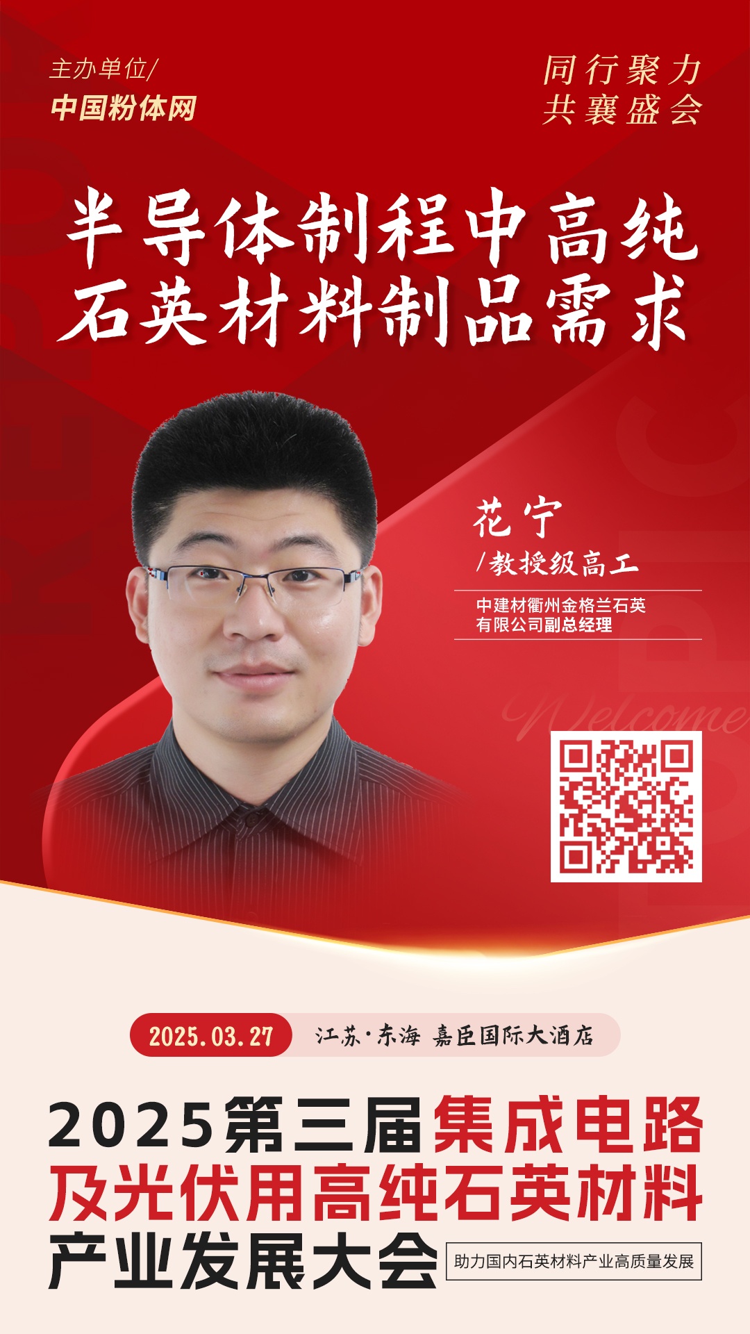 2025年3月27日,由中國粉體網主辦的“2025第三屆集成電路及光伏用高純石英材料產業發展大會”將在江蘇東海召開,來自中建材衢州金格蘭石英有限公司的副總經理花寧,將做題為《半導體制程中高純石英材料制品需求》的報告。