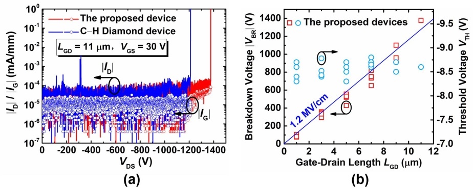實(shí)驗(yàn)結(jié)果顯示,該新型金剛石功率器件實(shí)現(xiàn)了-8.6 V的高閾值電壓和-1376 V的關(guān)態(tài)擊穿電壓,擊穿場(chǎng)強(qiáng)達(dá)到1.2 MV/cm,性能指標(biāo)遠(yuǎn)超國(guó)內(nèi)外同類器件水平。這一成果不僅是國(guó)際上首次報(bào)道硅終端溝道金剛石器件的高壓特性,更為未來(lái)高壓大功率系統(tǒng)的應(yīng)用奠定了堅(jiān)實(shí)基礎(chǔ)。