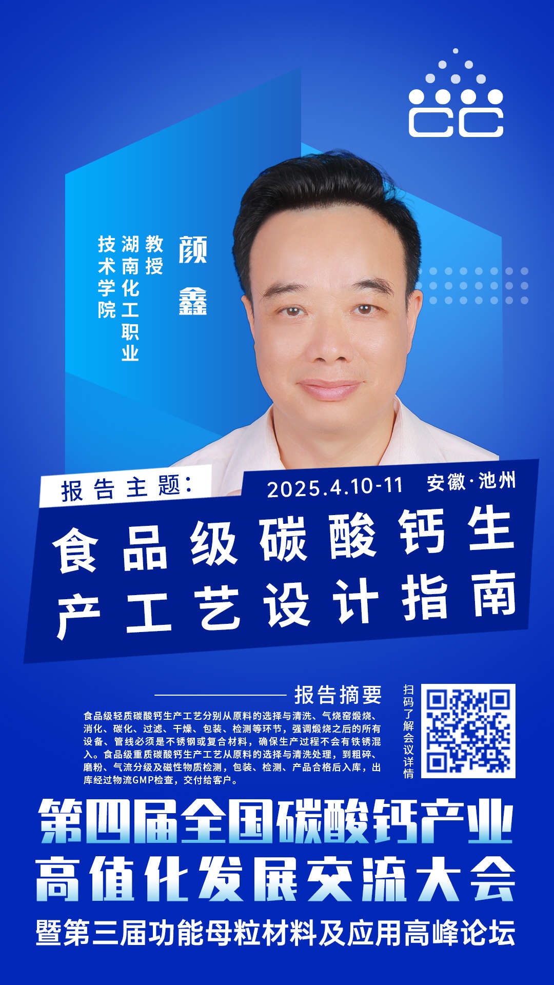 2025年4月10-11日,由中國粉體網(wǎng)主辦的第四屆全國碳酸鈣產(chǎn)業(yè)高值化發(fā)展交流大會將在安徽·池州舉行,屆時湖南化工職業(yè)技術學院顏鑫教授將在大會上作《食品級碳酸鈣生產(chǎn)工藝設計指南》主題報告,參照食品碳酸鈣標準,分享產(chǎn)品指標,與參會嘉賓交流食品級重鈣、輕鈣生產(chǎn)工藝設計理念。