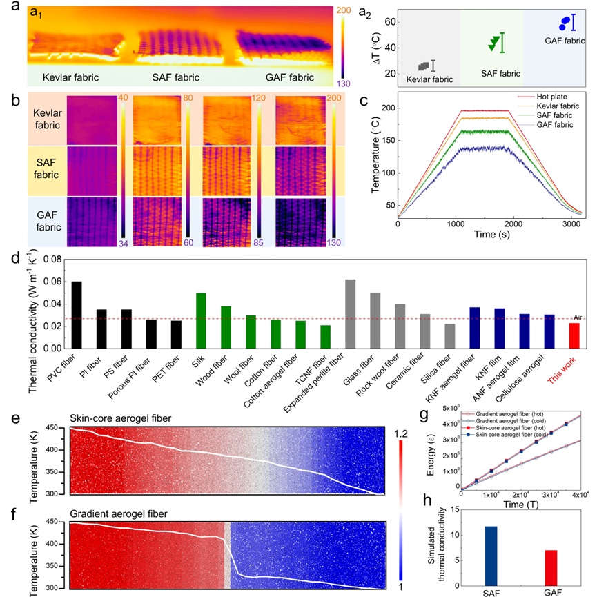 在超臨界干燥過程中,纖維表面的“外疏內密”結構發(fā)生反轉,最終形成梯度全納米結構的芳綸氣凝膠纖維(GAFs)。實驗表明,這種纖維的徑向熱導率低至0.0228 W/mK,比空氣(0.026 W/mK)還要低,較傳統(tǒng)氣凝膠纖維降低了30%-67%。