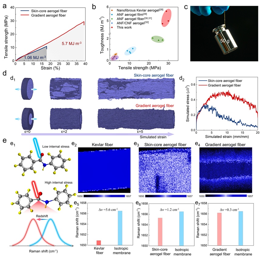 除了優(yōu)異的隔熱性能,GAFs的力學性能也實現(xiàn)了重大突破。實驗顯示,GAFs的抗拉強度達29.5 MPa,斷裂伸長率為39.2%,韌性高達5.7 MJ/m³。相比之下,傳統(tǒng)皮芯結構纖維的韌性僅為1.06 MJ/m³。GAFs在承受50克重量和1000次拉伸循環(huán)后,性能和形貌幾乎不變,展現(xiàn)出極高的穩(wěn)定性。