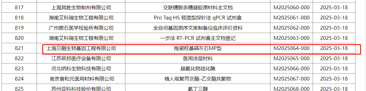 中國(guó)粉體網(wǎng)訊 3月18日,貝融生物生產(chǎn)的陶瓷羥基磷灰石MP型的醫(yī)療器械主文檔備案,登記編號(hào):M2025064-000。