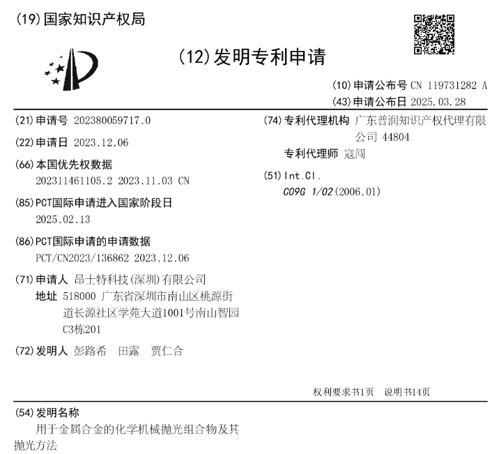 中國(guó)粉體網(wǎng)訊 近日,國(guó)家知識(shí)產(chǎn)權(quán)局信息顯示,昂士特科技(深圳)有限公司(以下簡(jiǎn)稱“昂士特”)取得一項(xiàng)名為“一種用于金屬合金的化學(xué)機(jī)械拋光組合物及其拋光方法”的專利,無腐蝕拋光設(shè)備中的金屬部件的風(fēng)險(xiǎn)。