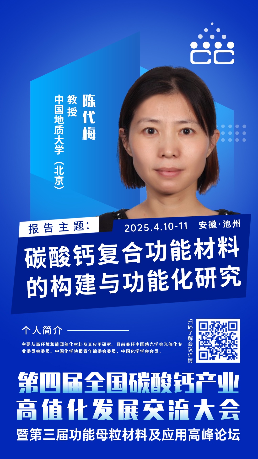 2025年4月10-11日,由中國粉體網主辦的第四屆全國碳酸鈣產業(yè)高值化發(fā)展交流大會將在安徽·池州舉行,屆時中國地質大學(北京)陳代梅教授將在大會上作《碳酸鈣復合功能材料的構建與功能化研究》主題報告,介紹采用碳酸化法制備CaCO3@SiO2的全流程技術工藝及其性能和應用前景。