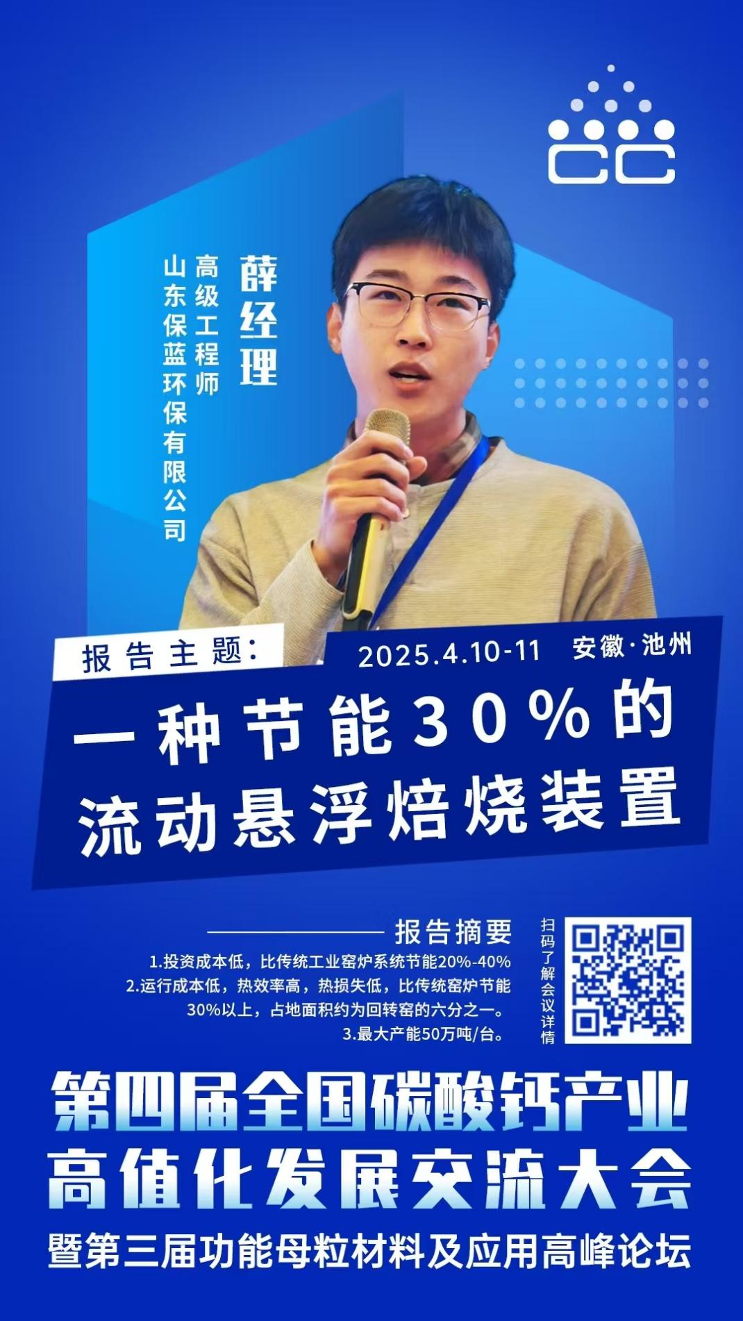 2025年4月10-11日,由中國粉體網主辦的第四屆全國碳酸鈣產業高值化發展交流大會將在安徽·池州舉行,屆時山東保藍環保有限公司工程師薛云漢將在大會上作《高效節能30%流動懸浮焙燒裝置》主題報告,為參會嘉賓介紹流動懸浮烘干焙燒裝置研發背景、技術原理、工作流程,分享應用案例等。