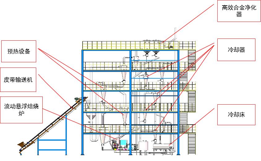 流動懸浮焙燒工藝包括:物料干燥→物料收集→物料焙燒→物料冷卻四個主要環節。