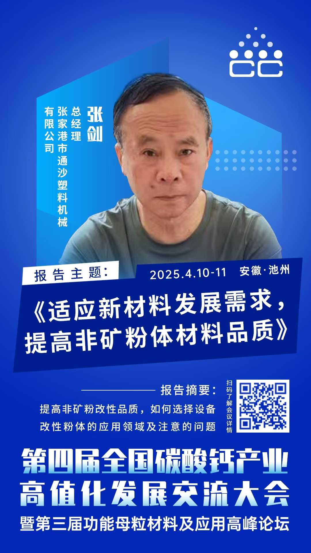 2025年4月10-11日,由中國粉體網主辦的第四屆全國碳酸鈣產業高值化發展交流大會將在安徽·池州舉行,屆時張家港市通沙塑料機械有限公司總經理張劍將在大會上作《適應新材料發展需求,提高非礦粉體材料品質》主題報告,重點介紹GX高效改性機、HEM高效混聯式改性機、HEM粉體改性生產線,分析改性粉體的應用領域及注意的問題。