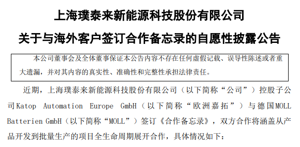 中國粉體網訊 4月9日,璞泰來發布公告稱,近期,控股子公司Katop Automation Europe GmbH(以下簡稱“歐洲嘉拓”)與德國MOLL Batterien GmbH(以下簡稱“MOLL”)簽訂《合作備忘錄》,雙方將圍繞MOLL德國鈉離子電池工廠項目全生命周期展開為期24個月的合作。