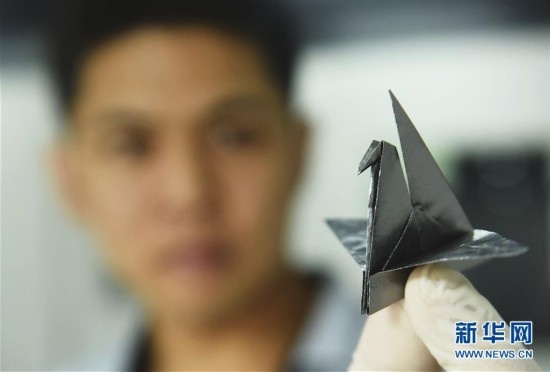 浙江大學(xué)博士生彭蠡在展示用高導(dǎo)熱超柔性石墨烯膜折疊而成的“千紙鶴”