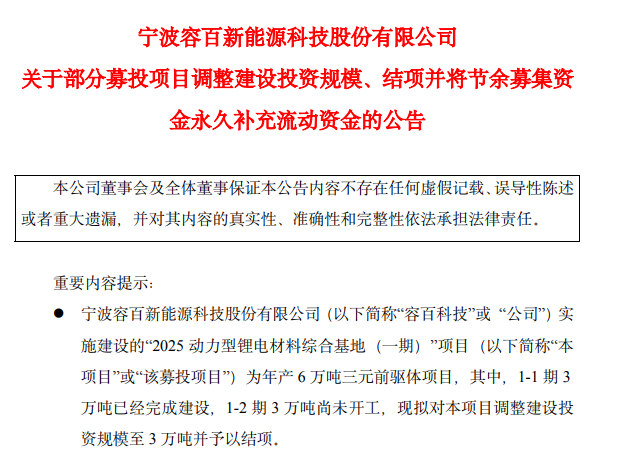 中國粉體網訊 4月9日,容百科技發布公告稱,實施建設的“2025動力型鋰電材料綜合基地(一期)”為年產6萬噸三元前驅體項目,其中,1-1期3萬噸已經完成建設,1-2期3萬噸尚未開工,現擬對本項目調整建設投資規模至3萬噸并予以結項。