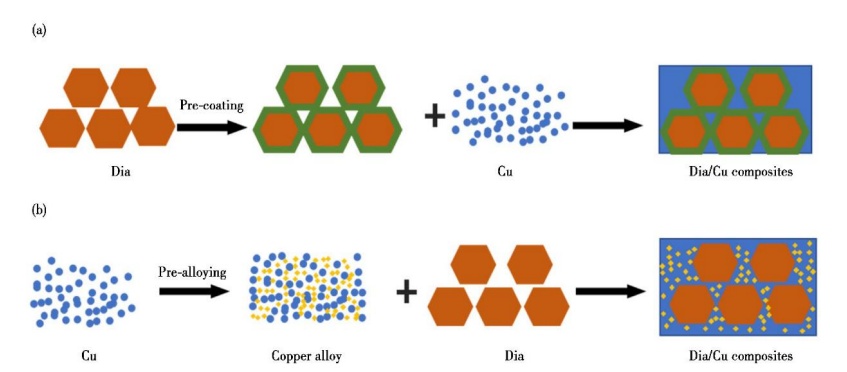 改性示意圖:(a)金剛石表面直接鍍覆;(b)基體合金化