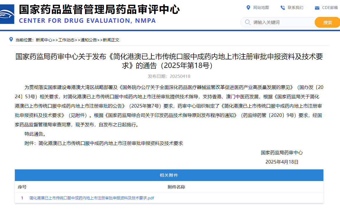 中國粉體網(wǎng)訊 4月18日,CDE發(fā)布《簡化港澳已上市傳統(tǒng)口服中成藥內(nèi)地上市注冊審批申報資料及技術(shù)要求》的通告(2025年第18號),明確為港澳傳統(tǒng)中成藥開辟"綠色通道"。此舉旨在推動粵港澳大灣區(qū)中醫(yī)藥產(chǎn)業(yè)一體化,助力港澳藥企高效進(jìn)入14億人口市場,同時為內(nèi)地患者引入優(yōu)質(zhì)傳統(tǒng)中藥產(chǎn)品。