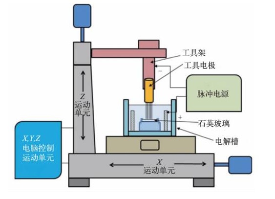 加工步驟:電化學(xué)放電加工法是一種將電火花加工(EDM)和電解加工(ECM)相結(jié)合的新型低成本玻璃微加工方法。將工具電極和對(duì)電極分別連接到電源的正、負(fù)端子上,當(dāng)兩個(gè)電極之間存在電位差時(shí),工具電極周圍會(huì)形成一層氫氣膜將工具電極與周圍的電解液完全隔離。當(dāng)電位差進(jìn)一步增大時(shí),氫氣膜破裂,產(chǎn)生電化學(xué)放電,并將玻璃融化并移除。