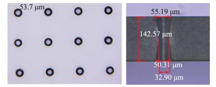 工藝特點(diǎn):聚焦放電產(chǎn)生玻璃通孔的方法可以制備多種類型的玻璃,如石英、鈉鈣玻璃、無堿玻璃、含堿玻璃等,該方法能夠制作均勻性較好、沒有裂紋的高密度通孔。但由于此方法是單次進(jìn)行單孔制作,所以生產(chǎn)效率較低,且從玻璃通孔的切片結(jié)果來看,通孔的形狀不是很垂直,可能會(huì)影響后續(xù)填充的效果。