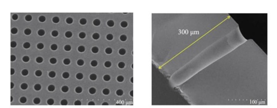 聚焦放電法制作的TGV陣列以及截面圖 來源:《玻璃通孔技術(shù)研究進(jìn)展》