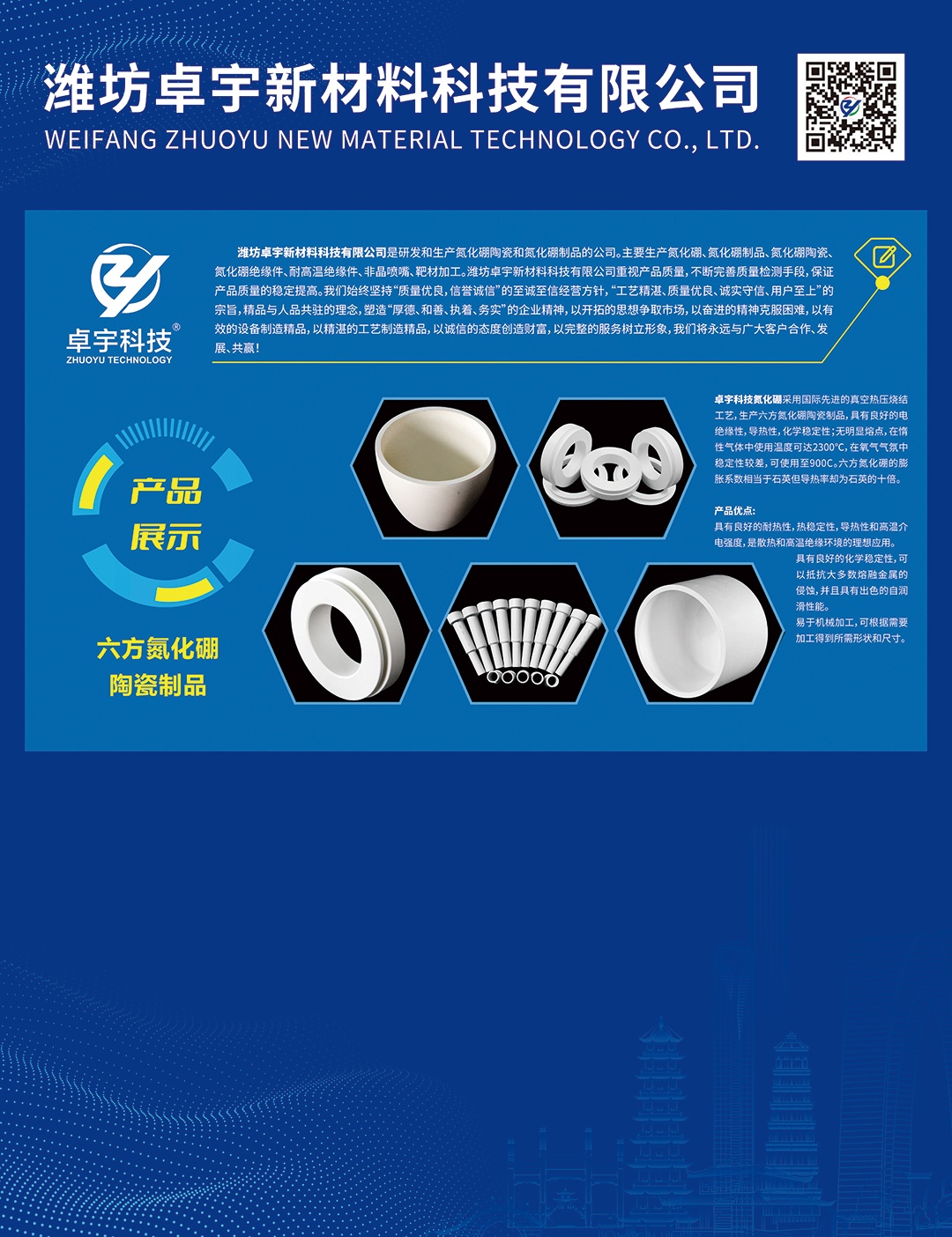 濰坊卓宇新材料科技有限公司是研發(fā)和生產(chǎn)氮化硼陶瓷和氮化硼制品的高新技術(shù)企業(yè),公司主要生產(chǎn)氮化硼、氮化硼制品、氮化硼陶瓷、氮化硼絕緣件、耐高溫絕緣件、非晶噴嘴、靶材加工。