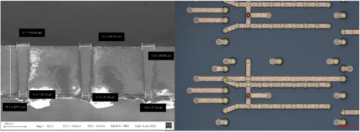 深光谷科技所開發的TGV光電interposer采用激光誘導刻蝕結合多層重布線(RDL)工藝,通孔深寬比4:1,基板厚度230um,表面平整度1.2um,支持2+1層RDL,挖槽深度60um,支持光纖陣列的耦合對準,支持電芯片flipchip封裝,支持EML/SOA/硅光/鈮酸鋰等光芯片植球倒裝,實測通孔和RDL布線帶寬超過110GHz。