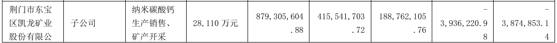 報(bào)告期內(nèi),子公司荊門市東寶區(qū)凱龍礦業(yè)股份有限公司營收188,762,105.76元,營業(yè)利潤3,936,220.98元,凈利潤3,874,853.14元。