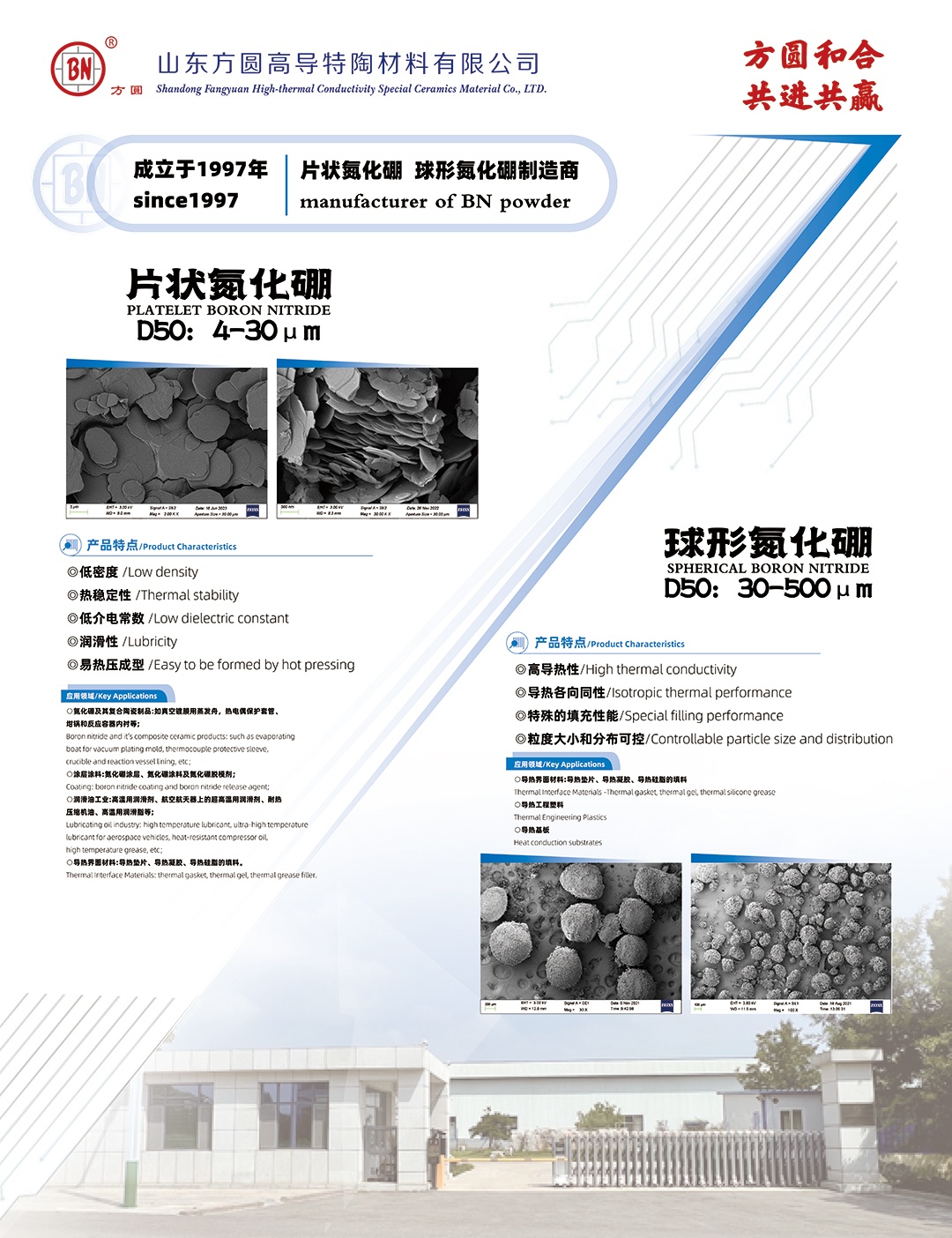山東方圓高導特陶材料有限公司是一家專注從事六方氮化硼粉體生產(chǎn)、銷售于一體的技術(shù)企業(yè)。公司擁有粉體生產(chǎn)設(shè)備和完善的產(chǎn)品檢測中心。公司通過了ISO9001質(zhì)量管理體系認證。