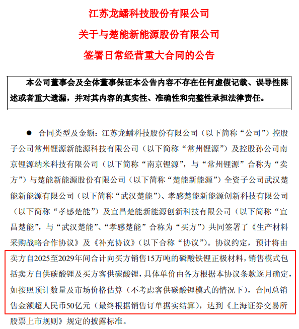 中國粉體網訊 5月9日,龍蟠科技公告稱,公司控股子公司常州鋰源及控股孫公司南京鋰源與楚能新能源全資子公司武漢楚能、孝感楚能及宜昌楚能共同簽署《生產材料采購戰(zhàn)略合作協(xié)議》及《補充協(xié)議》,預計自2025至2029年間常州鋰源及南京鋰源合計向買方銷售15萬噸磷酸鐵鋰正極材料,總銷售金額預計超50億元,協(xié)議有效期至2030年4月30日。