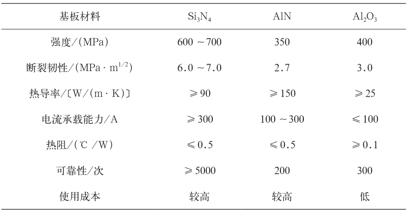 Si3N4陶瓷是綜合性能最好的陶瓷基板材料,熱導率可達90~120W/(m·k),熱膨脹系數為3.2×10-6/℃,并具有優異的機械強度、良好的化學穩定性和抗熱沖擊性。盡管Si3N4陶瓷基板具有略低于AlN的導熱性,但其抗彎強度、斷裂韌性都可達到AlN的2倍以上,同時,Si3N4陶瓷基板的熱膨脹系數與第3代半導體襯底SiC晶體接近,使其能夠與SiC晶體材料匹配性更穩定。