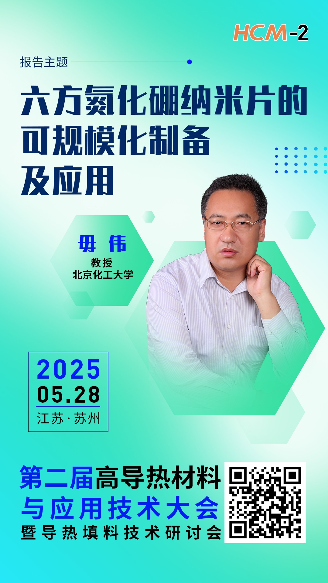 2025年5月28日,中國粉體網將在江蘇·蘇州舉辦“第二屆高導熱材料與應用技術大會暨導熱填料技術研討會”。屆時,我們邀請到北京化工大學毋偉教授出席本次大會并作題為《六方氮化硼納米片的可規;苽浼皯谩的報告。本報告將主要介紹低共熔溶劑體系和水-表面活性劑體系,復合剝離法低成本、高效、可規;苽淞降鸺{米片及羥基化六方氮化硼納米片的技術、原理及在導熱和吸附方面的應用,為六方氮化硼的大規模制備及應用提供一個新的方法和思路。