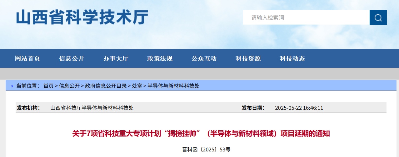 中國粉體網訊 近日,山西省科學技術廳發布重要通知,經2025年5月19日省科技廳第13次黨組(擴大)會議審議通過,同意7項省科技重大專項計劃“揭榜掛帥”(半導體與新材料領域)項目延期至2025年12月。這一舉措旨在給予科研團隊更充足的時間,全力攻克關鍵核心技術,推動山西在半導體與新材料領域實現技術飛躍,助力產業升級。