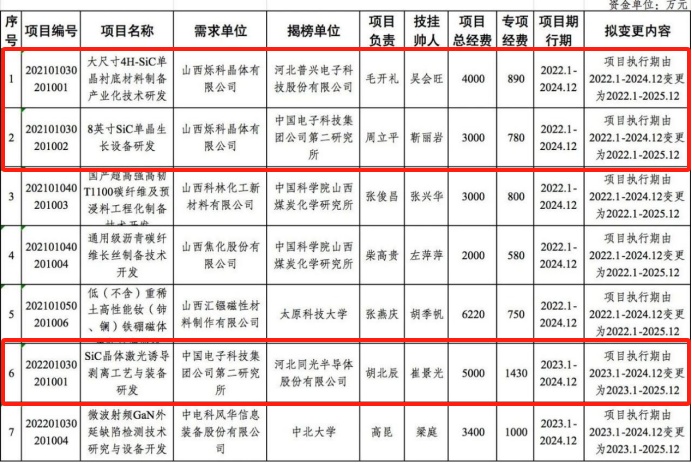 該項目由山西爍科晶體有限公司發起需求,河北普興電子科技股份有限公司揭榜。項目自2022年1月啟動,原計劃2024年12月完成,此次延期至2025年12月。