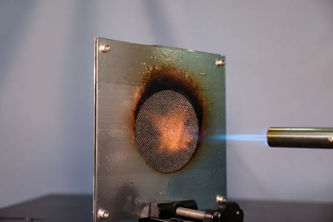 由玄武巖纖維再加工制作的面料,用1200℃的火槍噴10秒無(wú)明顯變化。記者胡冬冬攝
