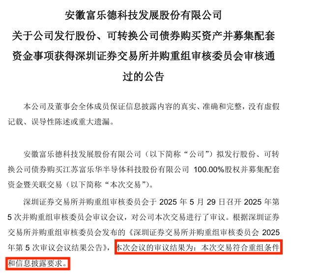 公告中表示,富樂德擬發行股份、可轉換公司債券購買江蘇富樂華半導體科技股份有限公司(以下簡稱“富樂華”)100.00%股權并募集配套資金暨關聯交易,經深圳證券交易所并購重組審核委員會審議,根據深圳證券交易所并購重組審核委員會發布的《深圳證券交易所并購重組審核委員會2025年第5次審議會議結果公告》,本次會議的審議結果為:本次交易符合重組條件和信息披露要求。