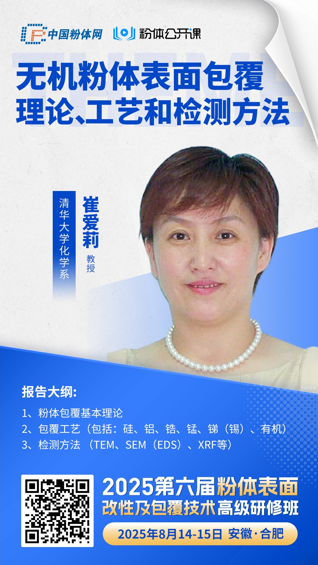 中國粉體網訊 為推動粉體表面改性及包覆技術發展,促進產學研交流合作,中國粉體網粉體公開課將于 2025 年 8 月 14 - 15 日舉辦 “2025 第六屆粉體表面改性及包覆技術高級研修班”。本次研修班特邀清華大學崔愛莉教授主講《無機粉體表面包覆理論、工藝和檢測方法》課程,為參會人員帶來了無機粉體表面改性領域的最新研究成果。