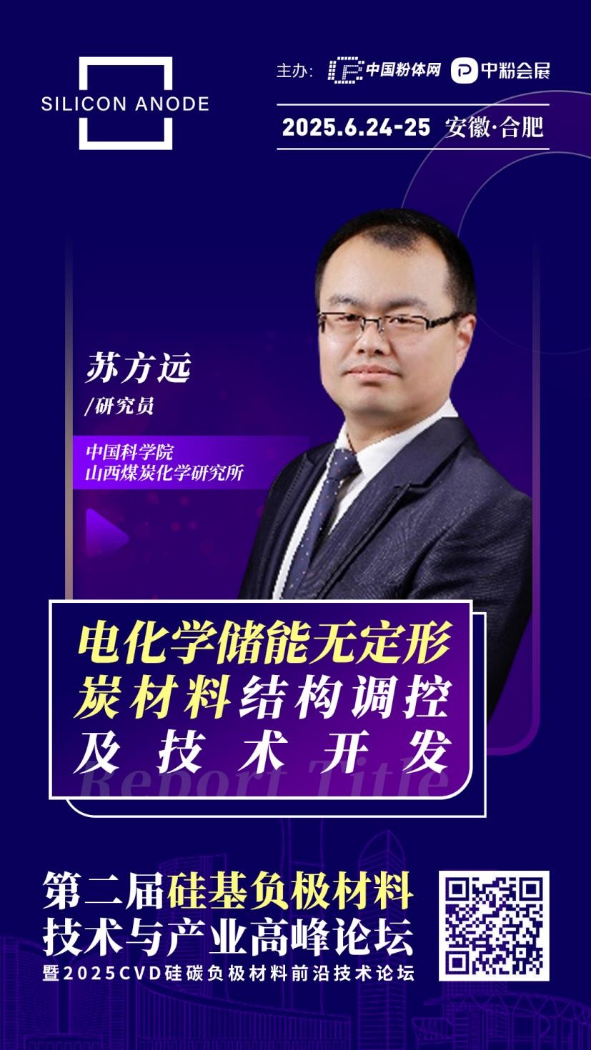 針對各類負極材料的產業化技術與國內外市場狀況,中國粉體網將于2025年6月24-25日在安徽·合肥舉辦第二屆硅基負極材料技術與產業高峰論壇暨2025CVD硅碳負極材料前沿技術論壇。大會旨在為負極材料產業鏈上中下游企業搭建深度交流的平臺,開展產、學、研合作,助推負極材料行業持續健康發展。屆時,來自中國科學院山西煤炭化學研究所的蘇方遠研究員將作題為《電化學儲能無定形炭材料結構調控及技術開發》的報告。