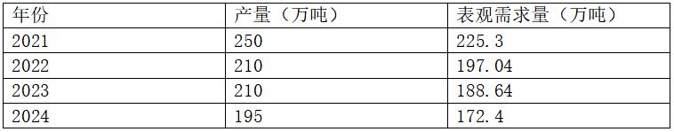2021年~2024年我國膨潤土產量、表觀需求量