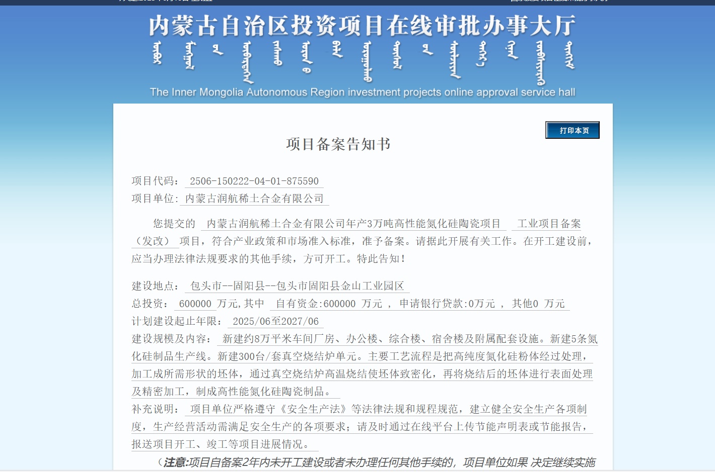 中國粉體網訊 近日,內蒙古自治區投資項目在線審批辦事大廳發布了內蒙古潤航稀土合金有限公司年產3萬噸高性能氮化硅陶瓷項目的備案公示。