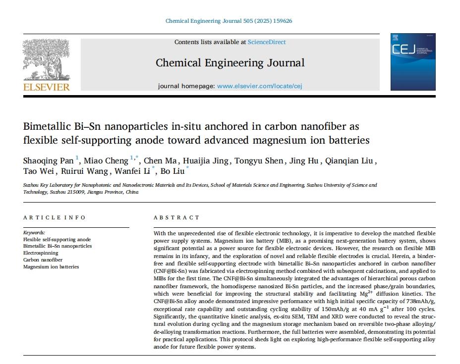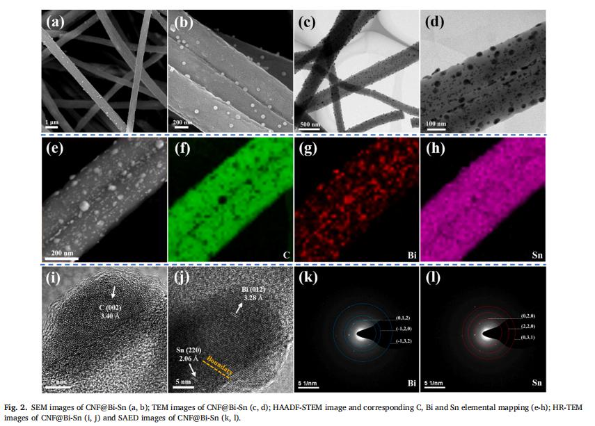 中國粉體網訊 近日,蘇州科技大學劉波教授課題組通過靜電紡絲法結合原位熱還原工藝,制備了一種無粘結劑且柔性的自支撐電極,該電極由雙金屬Bi-Sn納米顆粒錨定在碳納米纖維(CNF@Bi-Sn)中構成,并首次應用于鎂離子電池。