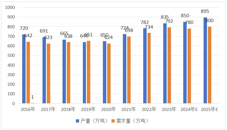 2016~2025年我國高嶺土產(chǎn)量、需求量