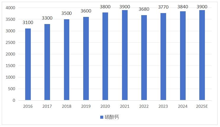 2016~2025年國內碳酸鈣需求統計及預測趨勢圖(單位:萬噸)