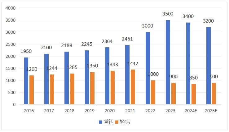 2016~2025年國內碳酸鈣產量統計及預測趨勢圖(單位:萬噸)