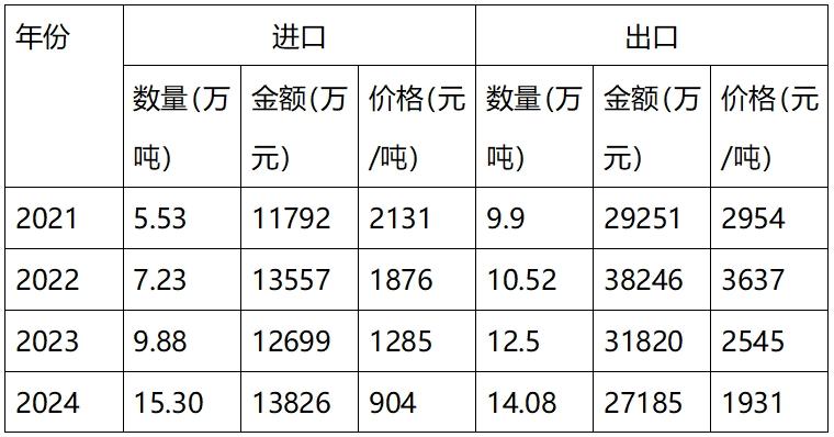 2021年~2024年碳酸鈣進出口情況