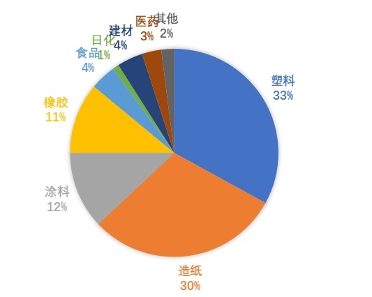 在塑料、建筑涂層、油漆、紙張、橡膠、顏色調配劑、粘合劑、封口膠、日常清潔、口香糖、食物、藥物和航空科學等多個領域與行業中,碳酸鈣這種新型材料都有所使用。在中國的碳酸鈣下游應用領域中,2024年塑料行業和造紙業是最主要的使用領域,分別占比31%和30%,涂料行業占比約13%,橡膠(膠粘劑)行業占比約12%,建材、食品和醫藥均占比約3%,其他占比約5%。