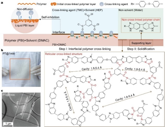 2025年6月,李先鋒研究員團隊與中國科學技術大學張宏俊研究員等合作,開發出新型界面交聯策略,制備出3μm厚高穩定性超薄聚合物膜,其分離層具1.8–5.4Å“準有序”孔徑結構,突破傳統聚合物膜選擇性與滲透性制約,用于全釩液流電池時在300mA/cm2 電流密度下能量效率超80%,還適用于堿性鋅鐵、水系有機液流電池,該成果以“Ultrathin membranes prepared through interfacial polymer cross-linking for selective and fast ion transport”為題發表于《自然-化學工程》,劉曉楠、石夢奇、廖晨伊為共同第一作者,研究獲國家自然科學基金等項目支持。