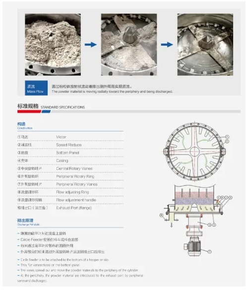 • 卸料盤根據物料流動特性,可采用30、40、45、55不同錐度,適用于各種粉料和糖料;