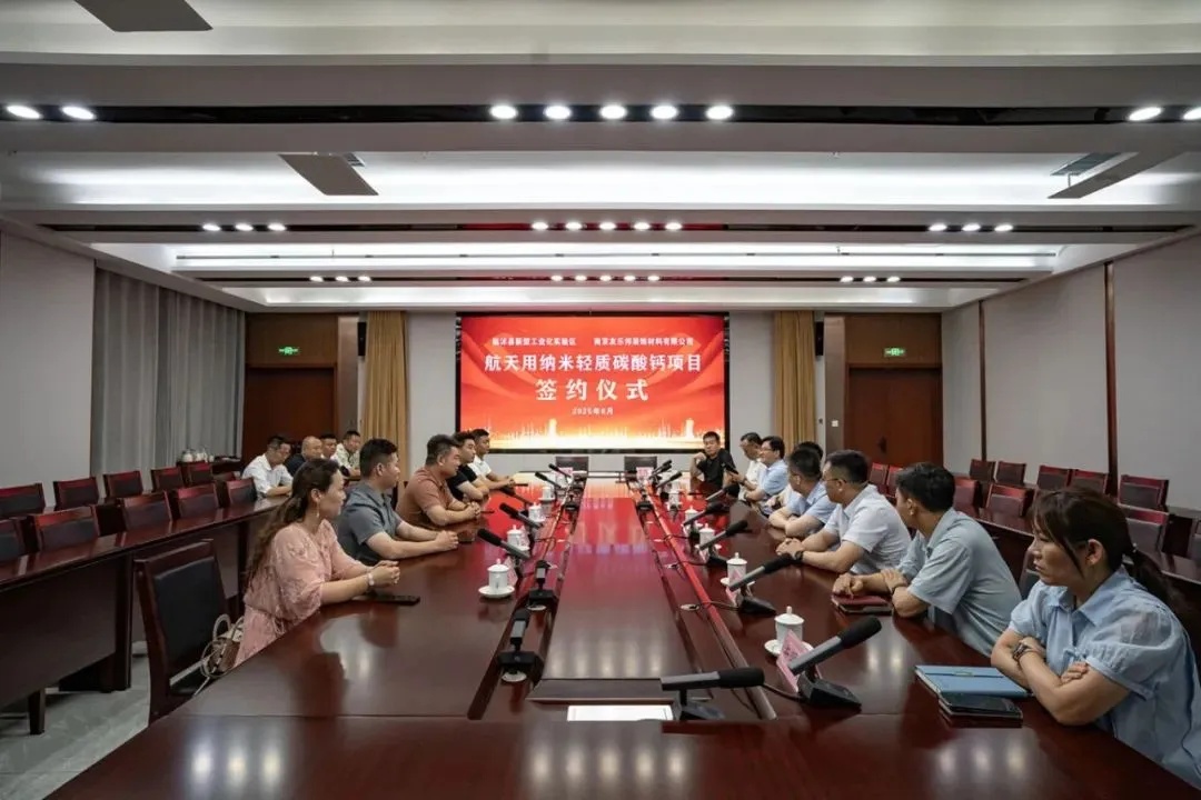 臨沭縣政府副縣長王傳義,南京友樂邦裝飾材料有限公司董事長訾興興等政企代表共同見證這一重要時刻。隨著訾興興董事長與臨沭縣新型工業化實驗區管理服務中心黨工委副書記、主任張勁松在合作協議上鄭重簽字,標志著這一高新技術項目正式落戶臨沭。該項目投產后將填補國內高端納米碳酸鈣在航天領域應用的空白,具有廣闊的市場前景。