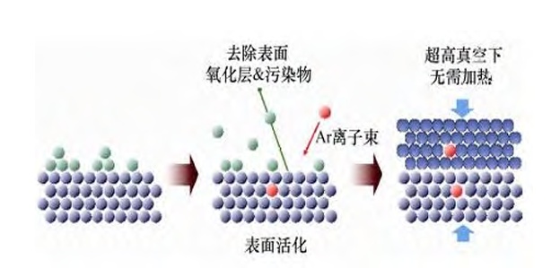 超高真空表面活化室溫鍵合:為消除傳統(tǒng)熱鍵合工藝中熱應(yīng)力引發(fā)的界面失穩(wěn)效應(yīng),研究者開(kāi)發(fā)出基于超高真空表面活化改性的室溫鍵合技術(shù)。該技術(shù)通過(guò)高能離子束轟擊鍵合表面,實(shí)現(xiàn)污染物剝離與氧化層刻蝕,同時(shí)誘導(dǎo)表層原子化學(xué)態(tài)重構(gòu),暴露出高活性亞穩(wěn)態(tài)原子層,進(jìn)而在室溫條件下通過(guò)物理接觸即可形成高強(qiáng)度化學(xué)鍵合。