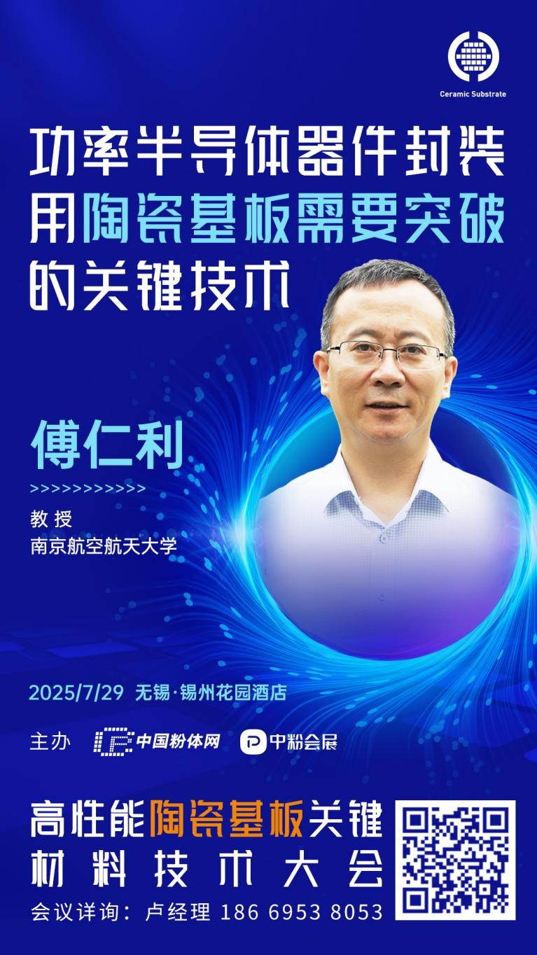 半導(dǎo)體及電子信息產(chǎn)業(yè)的快速發(fā)展對(duì)核心材料的性能提出了更高要求。陶瓷基板作為功率半導(dǎo)體器件的關(guān)鍵封裝材料,其導(dǎo)熱性能、機(jī)械強(qiáng)度、可靠性和精密程度直接決定了終端產(chǎn)品的性能與壽命。針對(duì)材料研發(fā)、制備工藝、檢測(cè)技術(shù)、應(yīng)用場(chǎng)景等核心議題,中國(guó)粉體網(wǎng)將于2025年7月29日在江蘇無(wú)錫舉辦2025高性能陶瓷基板關(guān)鍵材料技術(shù)大會(huì)。屆時(shí),南京航空航天大學(xué)教授傅仁利將作題為《功率半導(dǎo)體器件封裝用陶瓷基板需要突破的關(guān)鍵技術(shù)》的報(bào)告。