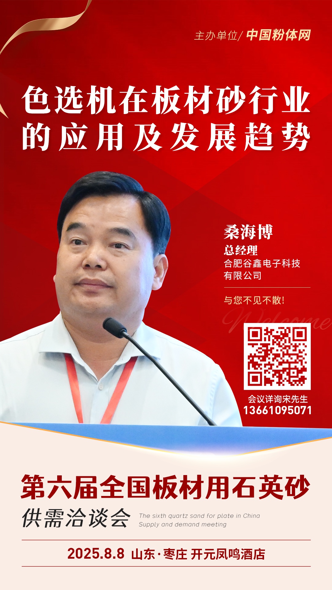 隨著人造石英石板材市場的蓬勃發(fā)展,石英砂作為核心原材料的品質(zhì)把控愈發(fā)關(guān)鍵,色選機(jī)在提升石英砂純度、保障板材質(zhì)量等方面的作用日益凸顯。2025年8月8日,由中國粉體網(wǎng)主辦的第六屆全國板材用石英砂供需洽談會即將在山東棗莊召開,合肥谷鑫電子科技有限公司總經(jīng)理桑海博將做《色選機(jī)在板材砂行業(yè)的應(yīng)用及發(fā)展趨勢》的報(bào)告,屆時(shí),他將對色選機(jī)在板材砂行業(yè)的應(yīng)用及發(fā)展趨勢等問題進(jìn)行詳細(xì)解讀。